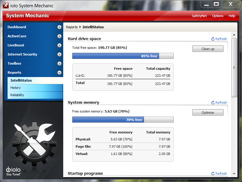IntelliStatus reports: monitor drive and memory usage, startup and running programs