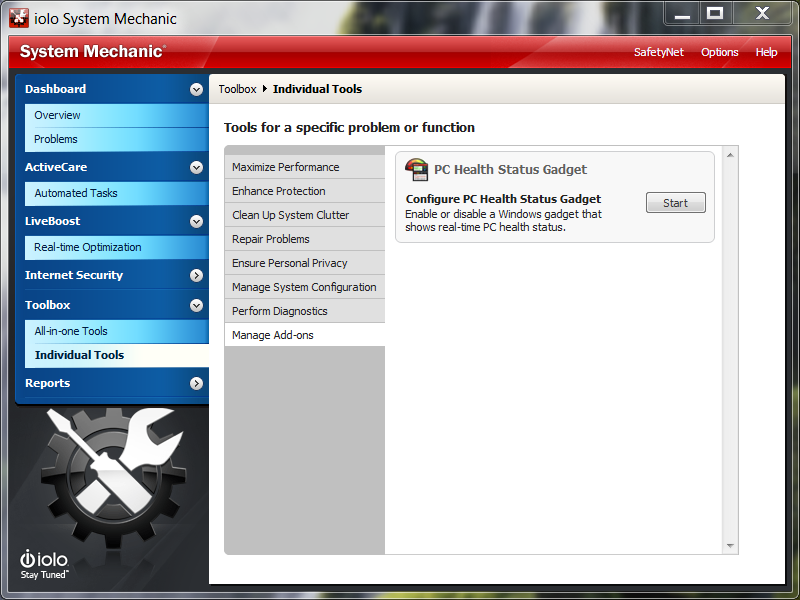 Manage add-ons: enable and manage System Mechanic’s Windows gadget for PC health status