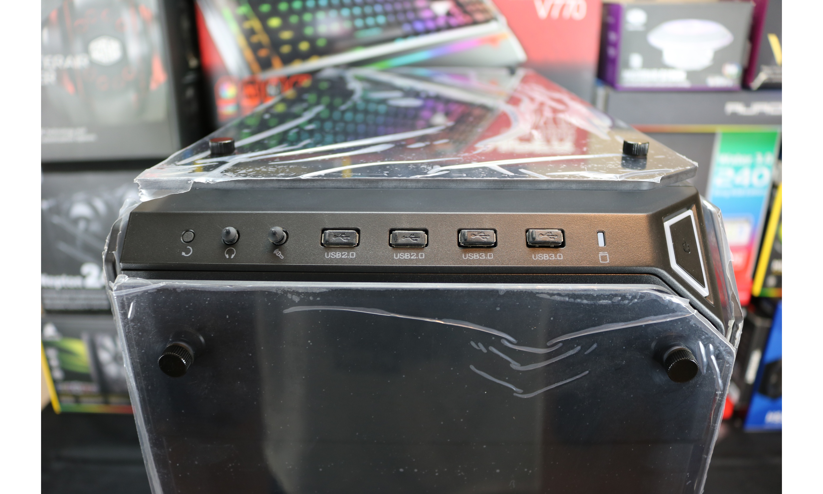 To start well look at the very similar top and front panels. These panels are a quick release removable design with the glass panels being removable as well. Right in between these panels is also the IO which consists of 2 USB 3.0 and 2 USB 2.0 ports.