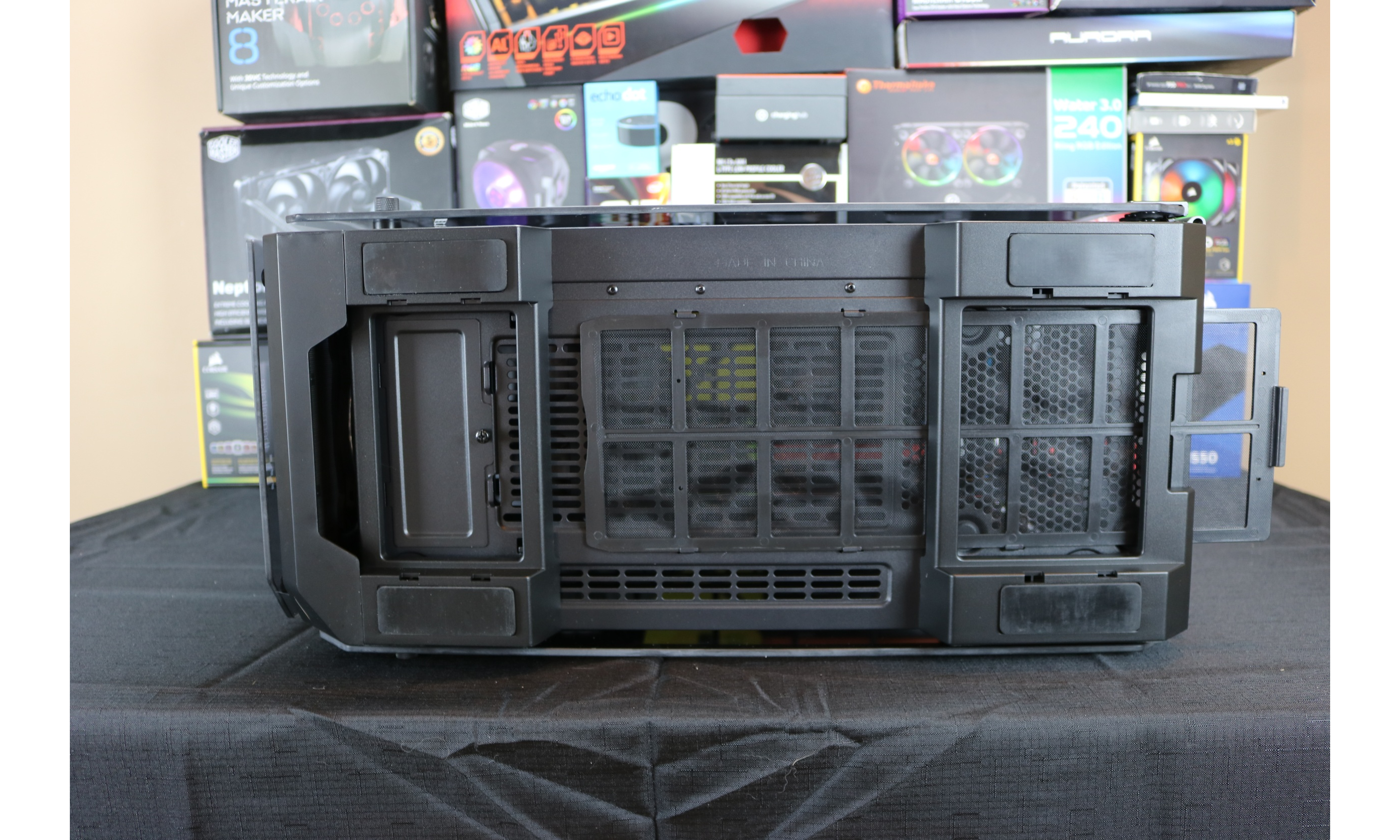We found these to be extremely grippy and were a very good choice of spacer in between the case and the resting place. You can also see the addition of a rectangular bracket here which is designed for a liquid cooler drain that we will touch on a little later. Last is a quick release dust cover for ease of cleaning and installation of fans.