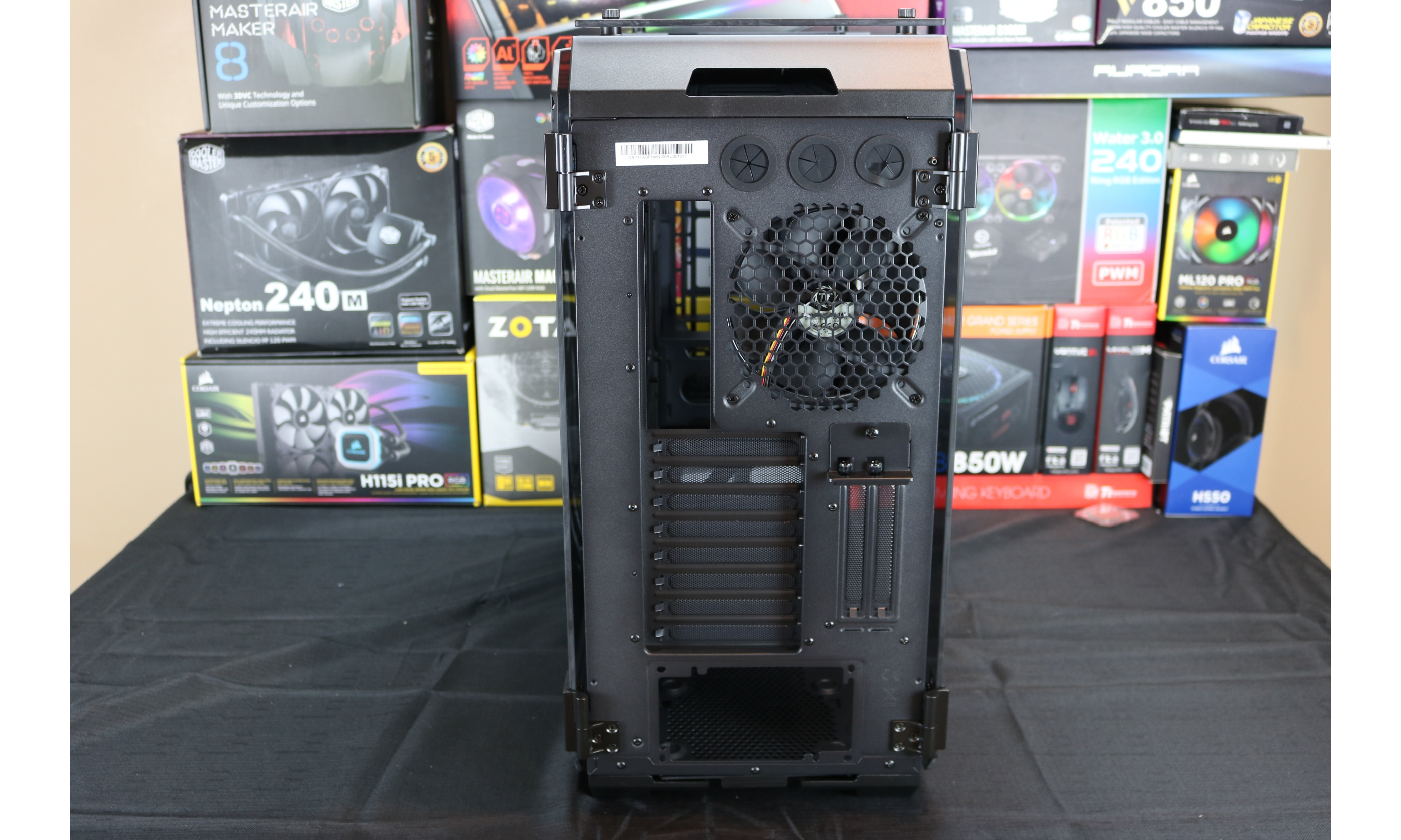 We also see a 140mm or 120mm fan exhaust port as well as a vertically mounted GPU connection area. We cant wait to stick our 1080 Ti in this slot to really show off our system.